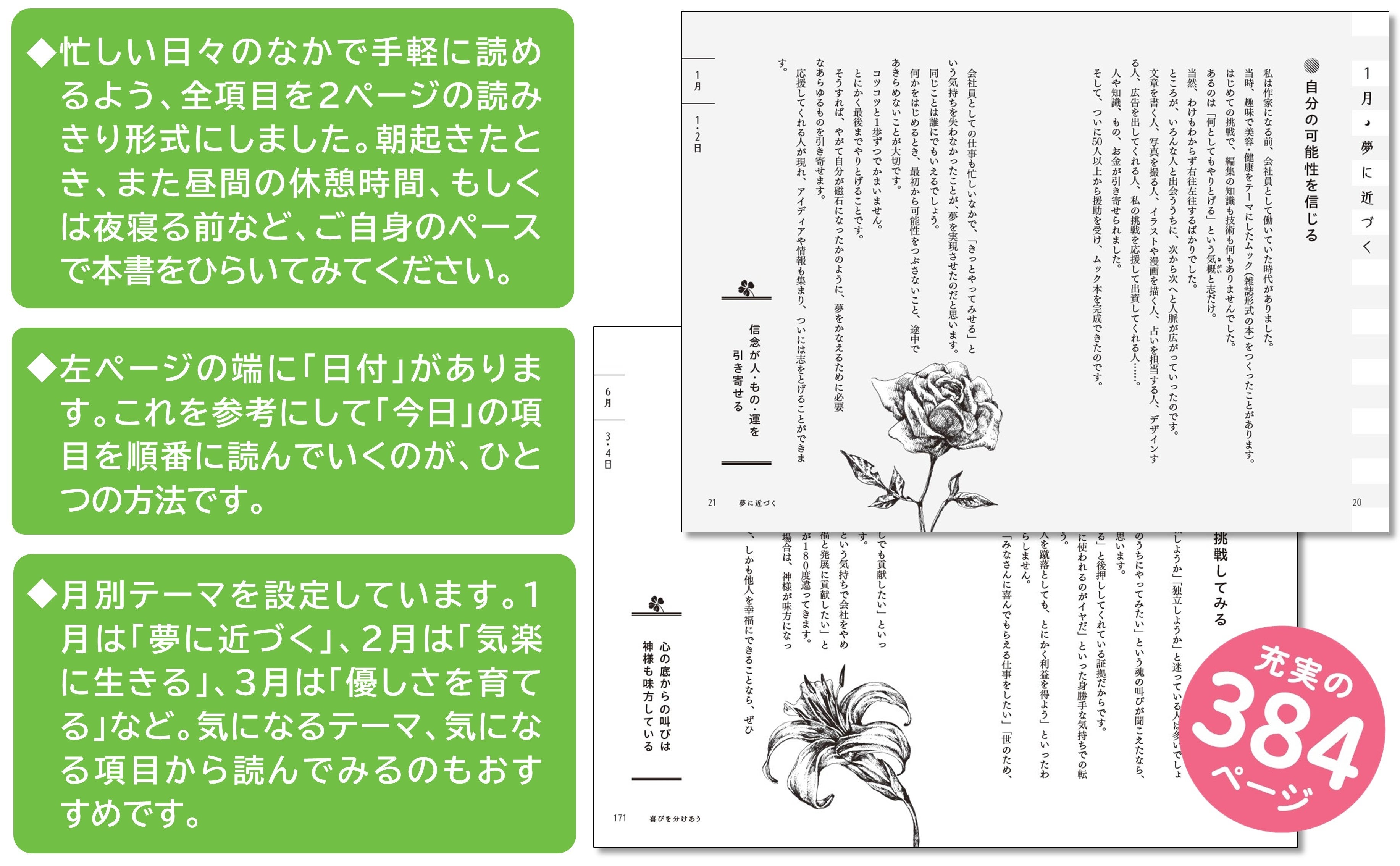 そこで、ファンにとっての愛蔵版のような、毎日、毎年、長く大事に読めるような一冊が、このたび登場! 四六判384頁の大ボリュームで、「今日の自分」の心が軽くなり、よりいきいきと快適に過ごせるようなコツを紹介します。