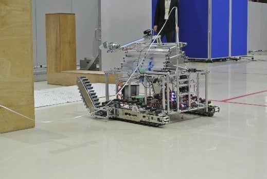 競技課題 :「福島第一原子力発電所原子炉建屋内における高線量エリアの遠隔高所除染を想定した競技を実施。高さ2700mm、幅1000mmの壁の上部が汚染されており、その部分を除染する。壁までの移動は指示された経路とする。実際の除染では表面を削るなどして放射性物質を取り除くが、本競技では指定のペンで壁に設置されている模造紙を塗り潰すことで、作業の精度を評価する。なお、除染は精度と効率が重視されることから、拭き取り精度と効率を高く評価し、スタート位置までの帰還は不要とする。」