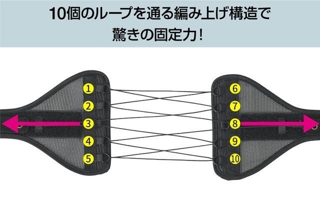 今までの腰ベルトは、着用時に緩まないように力を入れて締める必要がありました。しかしこの「Dr.PRO シャキット腰ベルト」は、両サイドのストラップを軽い力で引っ張るだけで、ギュ~と締まり驚きの固定力を実感できます!使用しているひもの引っ張り強度は約22kg/本が10本もあるのでお腹に力の入った時でも安心の強度を確保しています。
