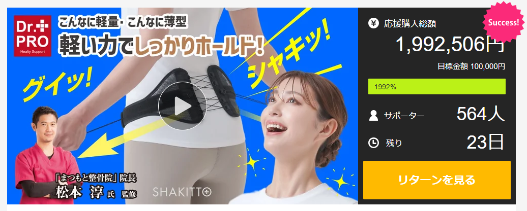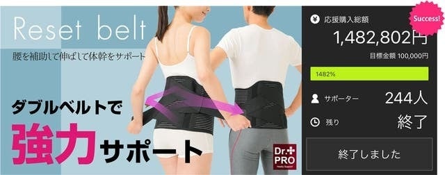 第一弾の「Dr.PROグイッと締める腰ベルトワイド」は1482%の達成率、244人の方に応援購入いただきました!