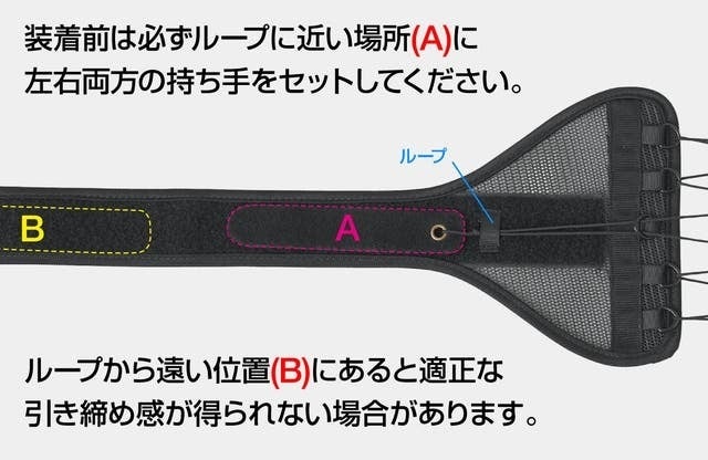 ※着用前に下写真を参考に締め上げベルトの位置を確認してください。