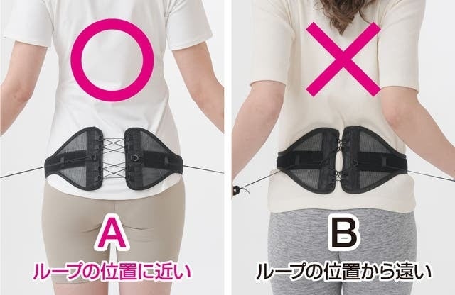 ①ベルトの両端を持って腰の位置に当て、左側のベルトをお腹側で押さえ、右側のベルトを引っ張り、面ファスナーをとめます。