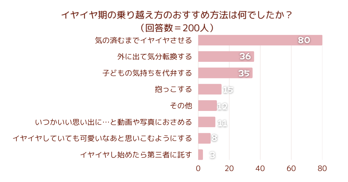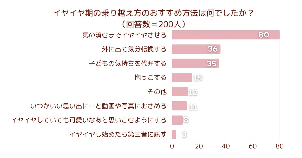 「イヤイヤ期の乗り越え方のおすすめ方法は何でしたか?」とアンケート調査した結果、1位は『気の済むまでイヤイヤさせる』でした。