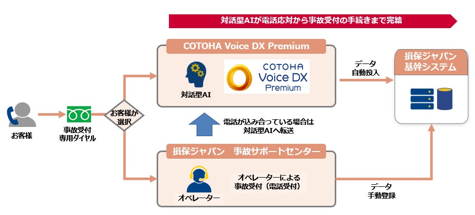損害保険ジャパン株式会社(代表取締役社長:白川 儀一、以下「損保ジャパン」)と、NTTコミュニケーションズ株式会社(代表取締役社長:丸岡 亨、以下「NTT Com」)は、損保ジャパンのコールセンター(事故サポートセンター)において、NTT Comの提供する対話型AI「COTOHA Voice DX Premium」を活用することで、最大で1時間あたり3,000件の保険金ご請求のご連絡を受け付ける体制を構築し、2023年1月から運用を開始します。