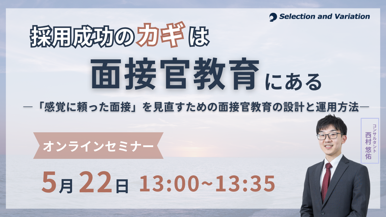 組織・人事コンサルティングファームであるセレクションアンドバリエーション株式会社(以下、当社、東京都千代田区丸の内、大阪市西区、名古屋市西区 / 代表取締役社長:平康慶浩/ URL:https://sele-vari.co.jp/ )は『採用成功のカギは面接官教育にある ―「感覚に頼った面接」を見直すための面接官教育の設計と運用方法―』セミナーを2026年5月22日(金)13:00〜13:35に開催することをお知らせいたします。