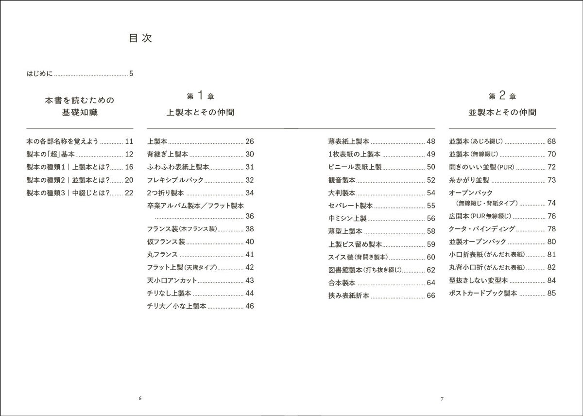 本書を読むための基礎知識/第1章 上製本とその仲間/第2章 並製本とその仲間/第3章 中綴じ・平綴じとその仲間/第4章 分類しにくい製本/第5章 リング製本とその仲間/第6章 和綴じとその仲間/第7章 小口加工/特別記事 帳簿製本を知っているか/インデックス① 製本名あいうえお順/インデックス② 目的別