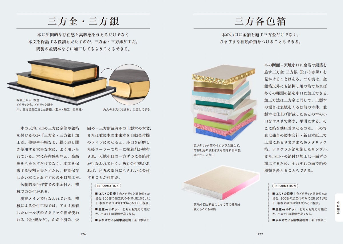 本書では、日本でいまできるさまざまな製本方法を、「上製本」「並製本」「中綴じ・平綴じ」「その他(分類しにくい製本)」「リング製本」「和綴じ」「小口加工」などに分類し、91項目ほど掲載。それぞれの製本の特徴を豊富な実例写真とわかりやすい文章で紹介します。さらには「コストの目安」「頼める製本会社例」「頼むときの注意点」など、実践で使える情報も網羅。実践ですぐに役立つこと間違いなしの1冊です!