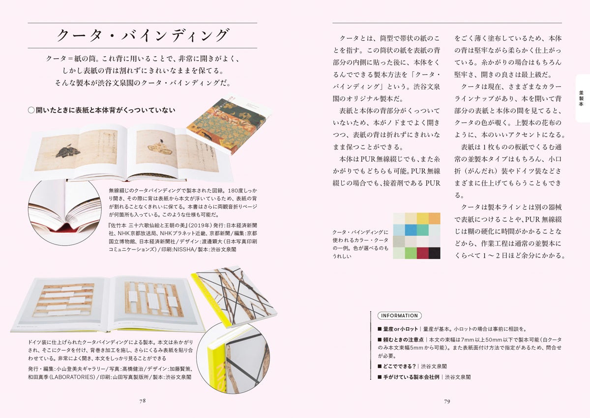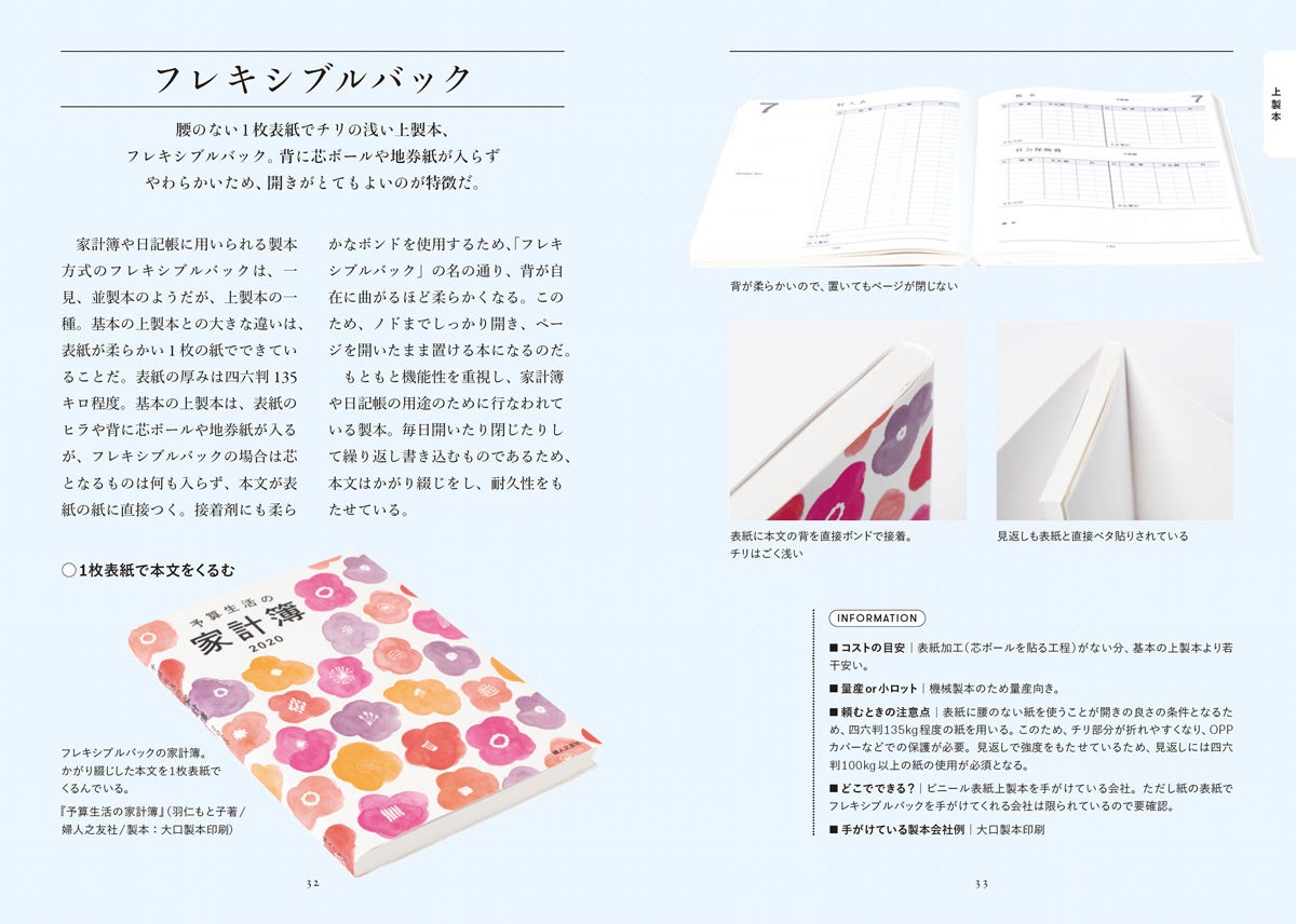 多種多様な製本方法を紹介する本書の製本では、180度ガバッと開いて背が割れない「オープンバック」を採用。詳細は本書P.80に掲載しています。