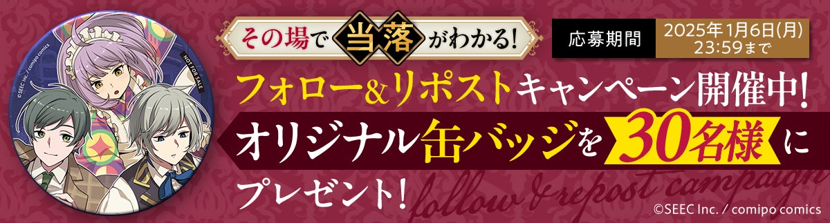 『誰ソ彼ホテル 』のWEBTOON配信を記念して、comipo限定缶バッジが当たるフォロー&リポストキャンペーンを開催します。