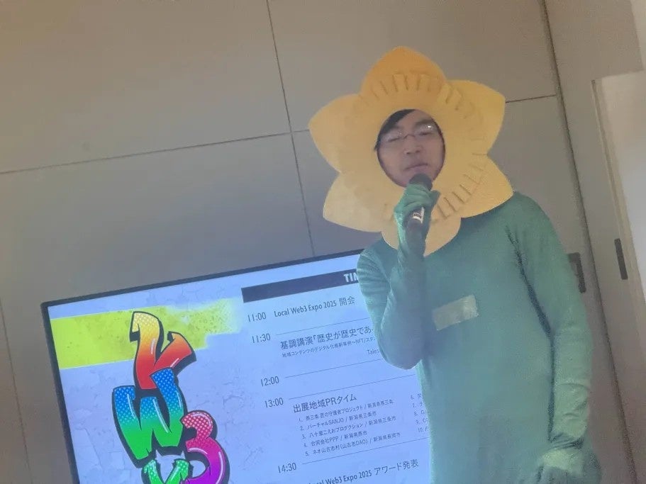 舟橋村DAOのブースでは、手作りのチラシや活動報告など、温かみのある掲示物を活用しての出展。DAOマネージャーのにしけんさんは、村のプロジェクトの象徴である「ひまわり」のかぶりものに緑の全身タイツという、一度見たら忘れられない装いで来場者を歓迎しました。