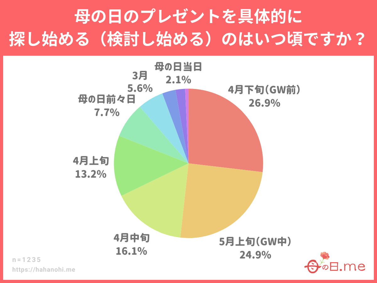 2026年に母の日.meがアンケート調査を行ったところ、「母の日のプレゼントを具体的に探し始める(検討し始める)のはいつ頃ですか?」という質問に対し、最も多かったのは「4月下旬(GW前)」の26.9%、次いで「5月上旬(GW中)」の24.9%という結果となりました。また「4月中旬」(16.1%)や「4月上旬」(13.2%)も含めると、約8割近くの人が母の日の約1か月前からゴールデンウィークにかけてプレゼント探しを始めていることが分かりました。