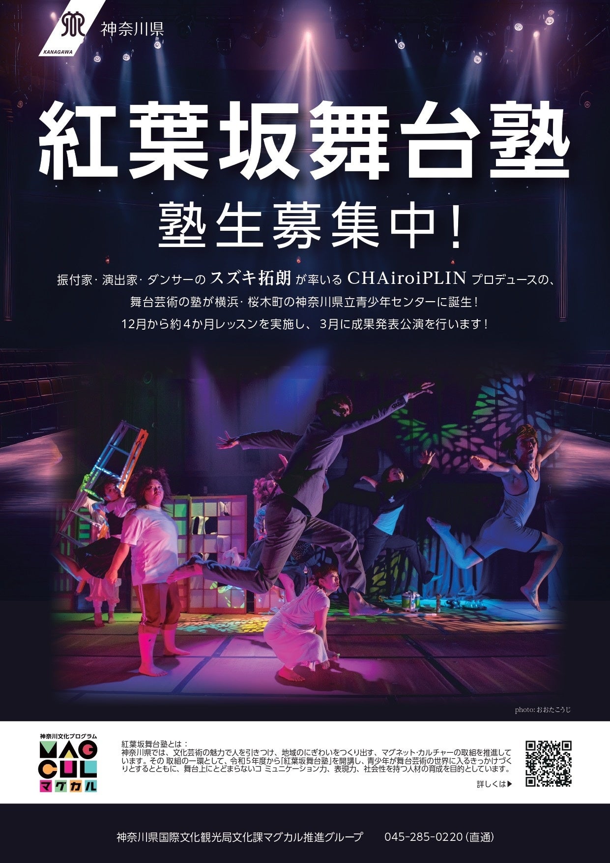 この取組の一環として、青少年が舞台芸術に関する様々な分野を複合的に学ぶことで、コミュニケーション力、表現力、社会性を持つ人材を育成する「紅葉坂舞台塾」の塾生を追加募集しますので、お知らせします。