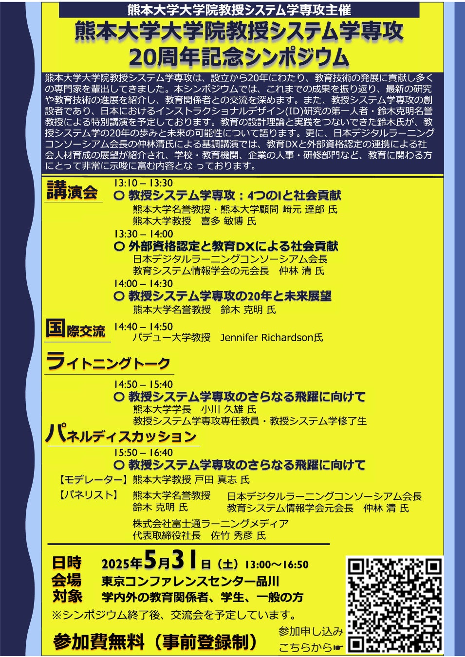 『熊本大学大学院 教授システム学専攻 開講20周年記念シンポジウム〜教授システム学の20年と未来を語る〜』の開催について