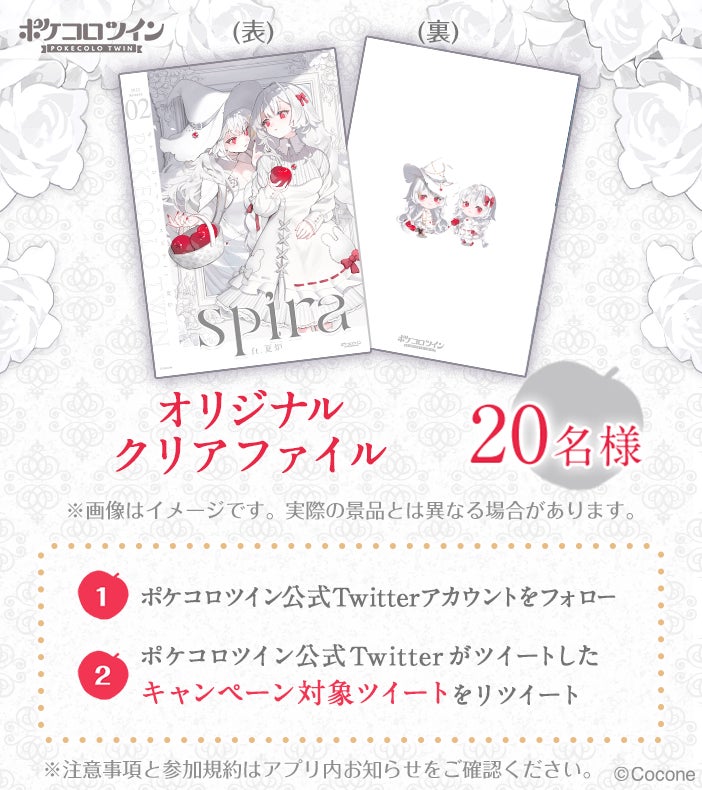 夏炉さん書き下ろしのキービジュアルを全面プリントしたオリジナルクリアファイルが、抽選で20名様に当たるTwitterキャンペーンを実施します。応募方法は、『ポケコロツイン』公式Twitterアカウント(@PokecoloTwin)をフォロー&指定ツイートをリツイートするのみ。詳細はアプリ内のお知らせをご参照ください。