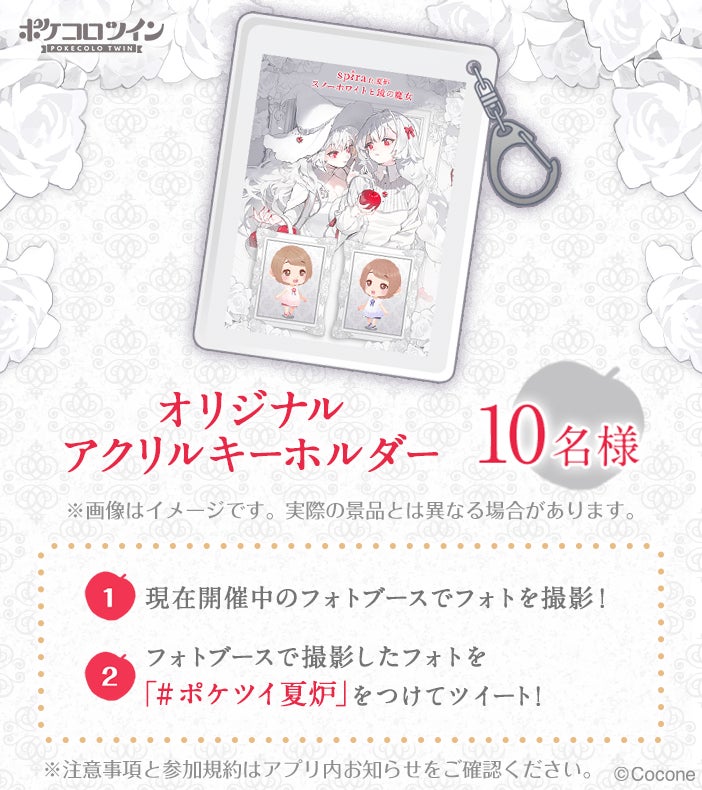 アプリ内の指定フォトブースで撮影したスクリーンショットを、Twitterで指定ハッシュタグと合わせてツイートをすると応募完了。投稿画像をそのまま用いた当選者だけのオリジナルアクリルキーホルダーを、抽選で10名様にプレゼントします。詳細はアプリ内のお知らせをご参照ください。