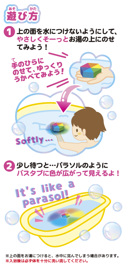 そーっと浮かべると、まるでお風呂にパラソルが開いたみたい!