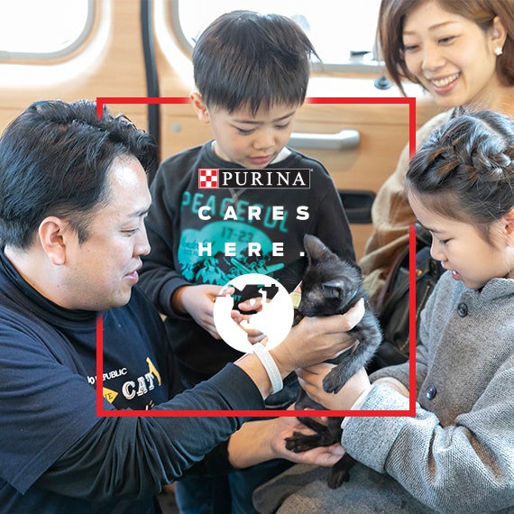 ネスレ ピュリナは、人とペットの共生社会実現のために、ペットをとりまく社会問題の解決に向けた取り組みを進めています。一つの事例として、保護猫の認知拡大と譲渡の促進のために、保護猫カフェのような車内空間をそなえた「ネコのバス」を活用した譲渡会を、全国各地やオンラインで開催しています。