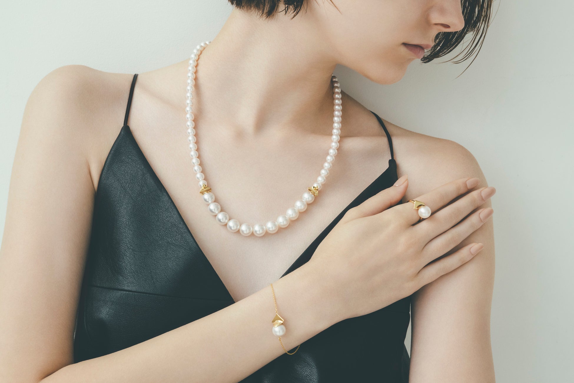 無垢な美を湛えたパールのまろやかな光沢を放つホワイトとシャープながらもしなやかなスクエアフォルムのゴールドのコントラストが、それぞれの素材を際立たせ、洗練されたデザインに仕上がりました。南洋真珠 白蝶、あこや真珠との組み合わせや、淡水真珠の繊細な煌めきが宿るリングなど幅広いオケージョンに合わせられる様々なジュエリーが登場します。