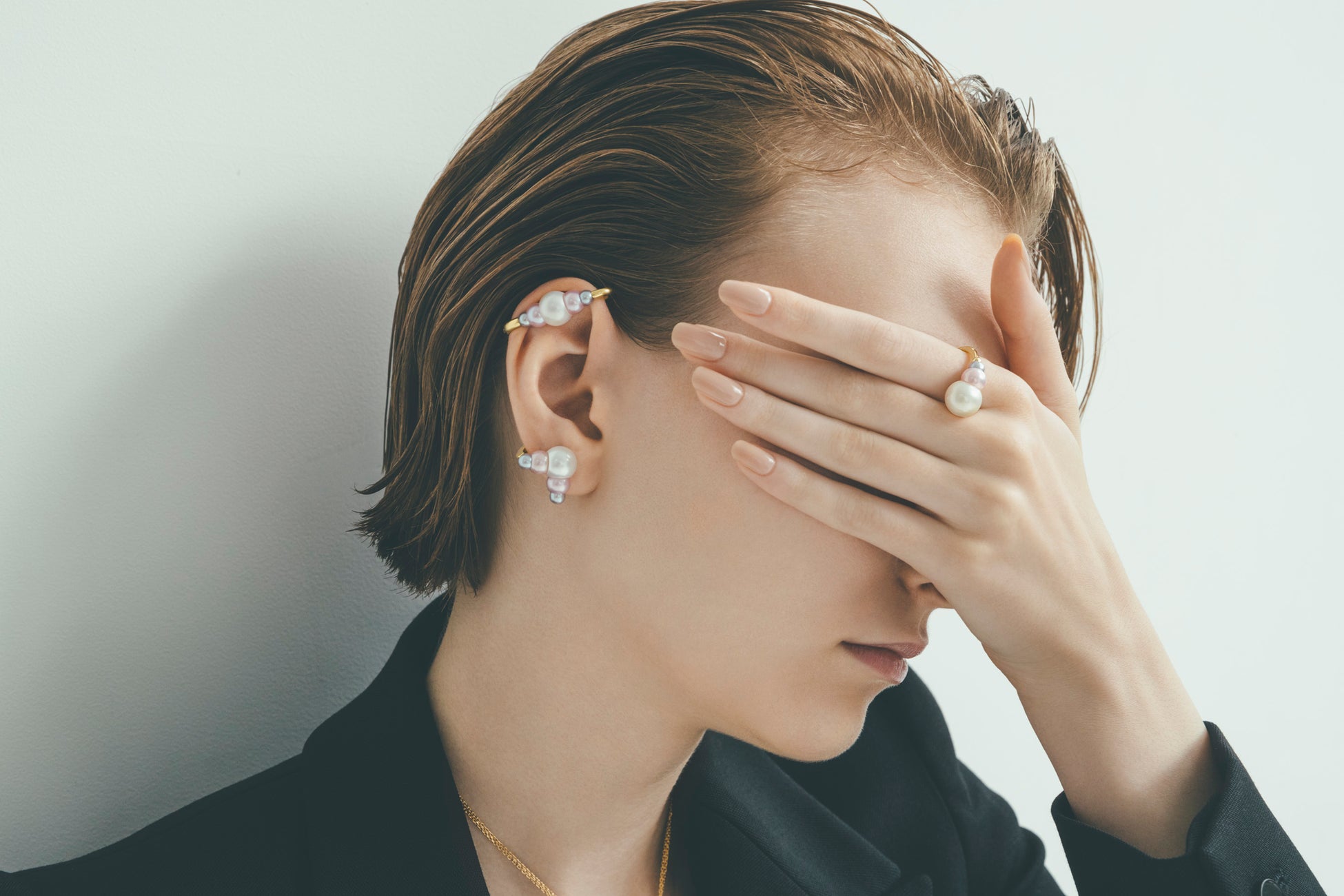 淡く優しいカラーと、大きさの異なる3つのパールを組み合わせ、1つのパールから新たなパールが生まれて連鎖していくかのようなイノベイティブなフォルムのジュエリーが登場します。アレンジがお楽しみいただけるネックレスや、「M/G TASAKI」初のイヤーカフが登場し、遊び心たっぷりにパールの新しい概念を提案するモダンなデザインです。
