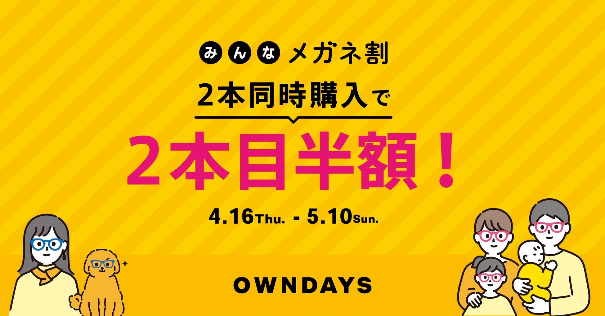 メガネ・サングラスの製造販売を手掛ける株式会社オンデーズ(本社:東京都品川区、代表取締役社長:海山丈司)は、2026年4月16日(木)より、メガネやサングラスを2本以上同時にご購入いただくと、2本目以降の商品がすべて半額になる「みんなメガネ割」を開催いたします。対象店舗は、OWNDAYS全国の店舗(アウトレット店舗を除く※1)・オンラインストアにて実施いたします。