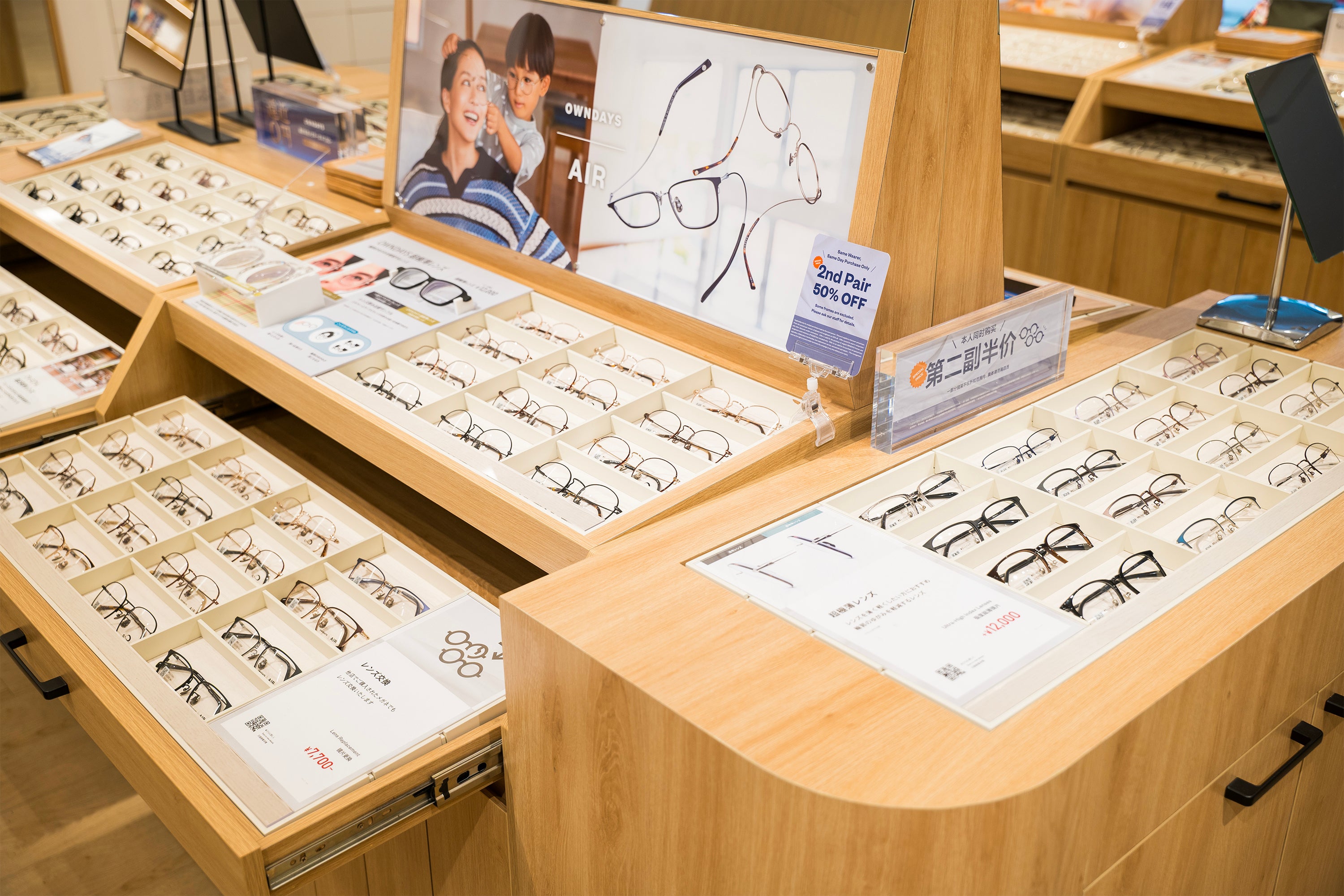 アイウェアは、顔という視線が最も集まるパーツに身につけるアイテムだからこそ、「似合うか不安」「失敗したくない」という気持ちが働きやすく、無難なデザインを選びがちです。ファッションや気分に合わせて自由に楽しめるアイテムとして確立しつつも、新しいデザインやカラーなどは“挑戦しづらい存在”になっているのが現状です。 こうした背景を踏まえ、本施策では2本目以降が半額になる仕組みにより、これまで手に取りづらかったデザインやカラーにも気軽に挑戦できる機会を提供します。