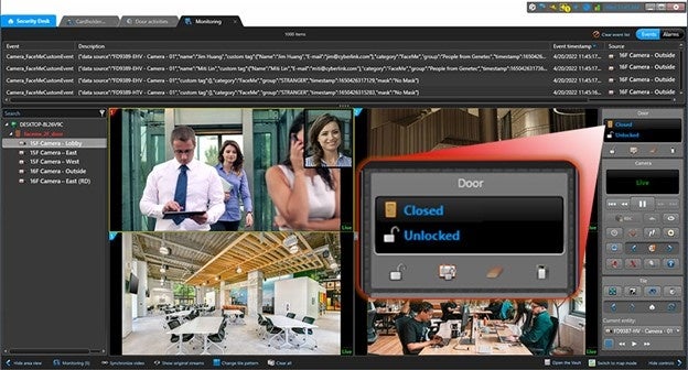 また、Genetec Security Center は、数台のカメラを収容したセキュリティ監視システムから、数十万台までのカメラも収容、統合出来るVideo Management Systemです。また、入退室管理システムも1つのソフトウェアで動作しており、顔認証機能を提供するサイバーリンク社との連携は非常に効果的で、入退室管理に顔認証機能を統合する事が可能です。