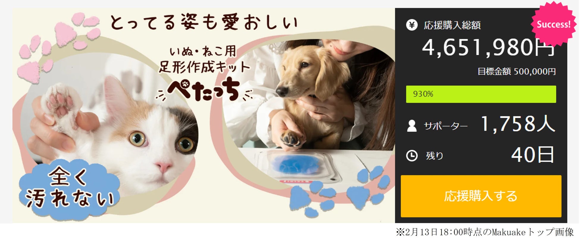 こうした背景からもペットに関するグッズの需要が高まっており、「ぺたっち」を応援購入していただいた方からは、「肉球が汚れないのは助かる」「こんな商品を探していた」など、ペットの負担にならず思い出が残せるというコンセプトに共感する声が多くありました。