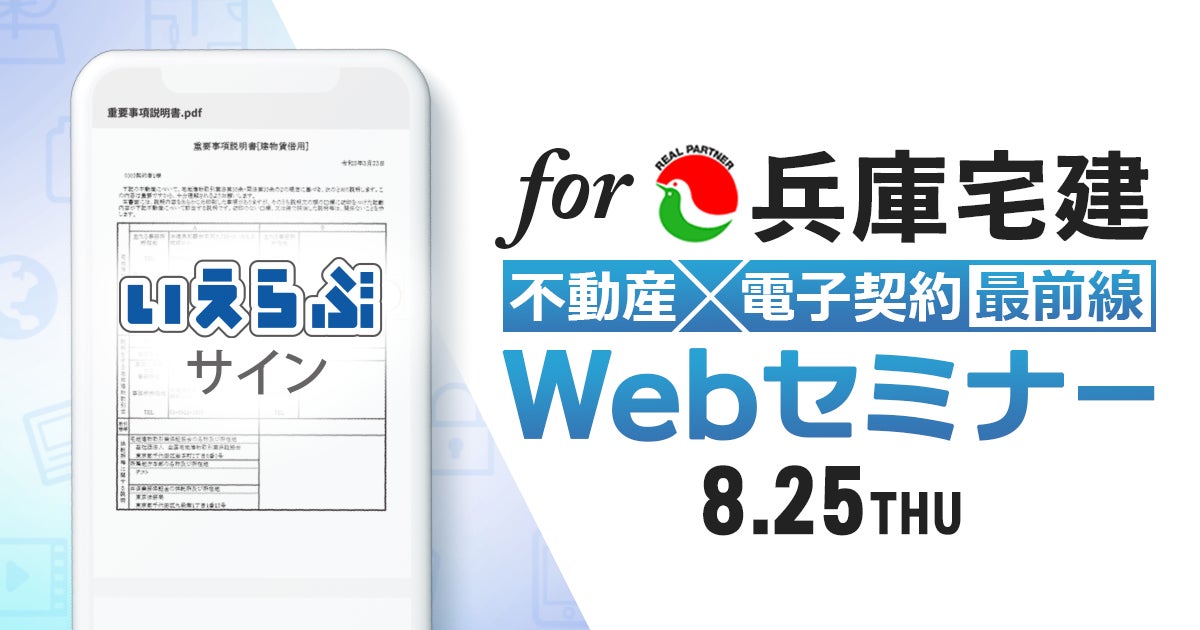 不動産業務支援に特化したバーティカルSaaSを提供する株式会社いえらぶGROUP(以下「いえらぶGROUP」)は、不動産に特化した電子契約システム「いえらぶサイン」に関するWebセミナーを、2022年8月25日に、兵庫県の宅地建物取引業者の8割が加盟する一般社団法人兵庫県宅地建物取引業協会(以下「兵庫宅建」)に向けて、開催いたします。