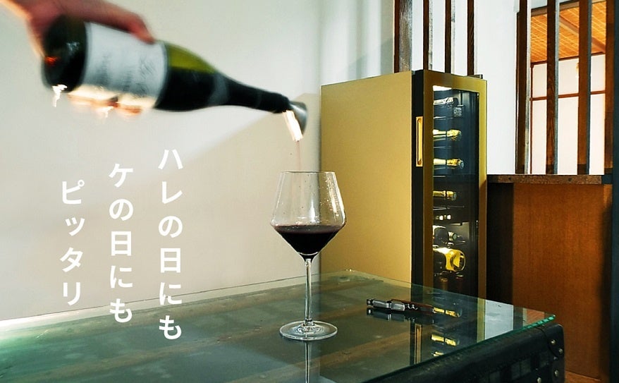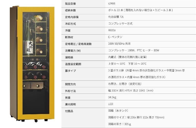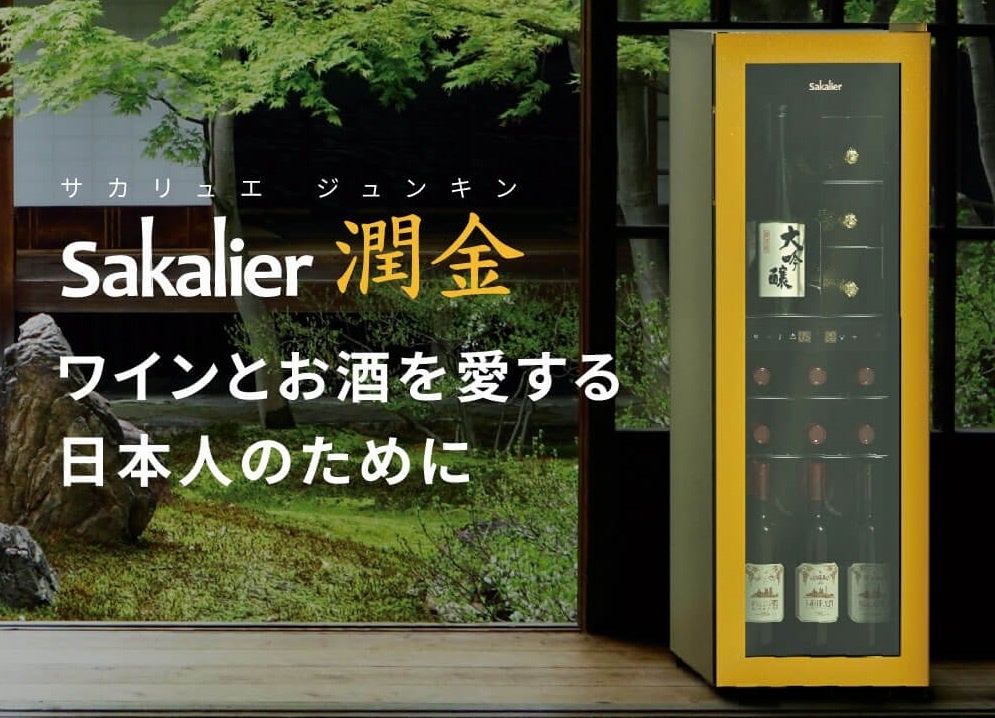 日本の住まいに設置しやすいスリムな小型サイズで、一升瓶も収納できる「サカリュエ 潤金」。料理に合わせて、ワイン、シャンパン、日本酒など、いろんなお酒を楽しむための新セラーが登場。