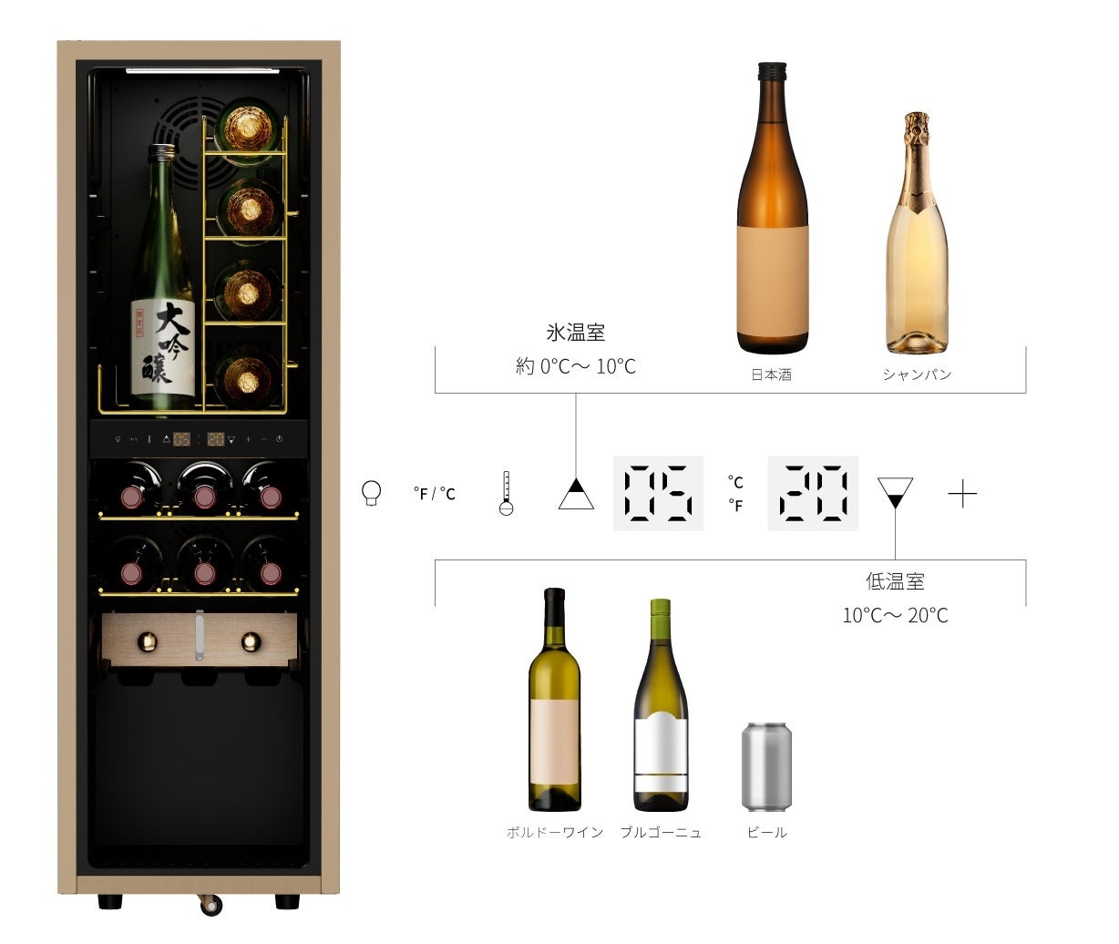 日本酒の一升瓶もラックを外さず縦置きできる「サカリュエ 潤金」は2温度管理が可能で、上室は約0℃~10℃、下室は10℃~20℃で1℃ずつ設定できます。そのうえ、冷却能力が高く、周囲温度の影響を受けにくいコンプレッサー式だから、庫内の温度をキープ。
