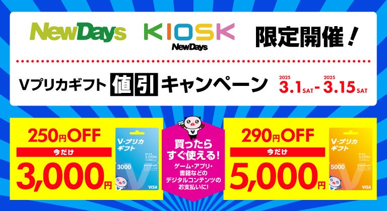 キャンペーン期間中、NewDays店内のギフトカードコーナーにあるVプリカギフトを購入すると、通常価格よりお安くお求めいただけます。