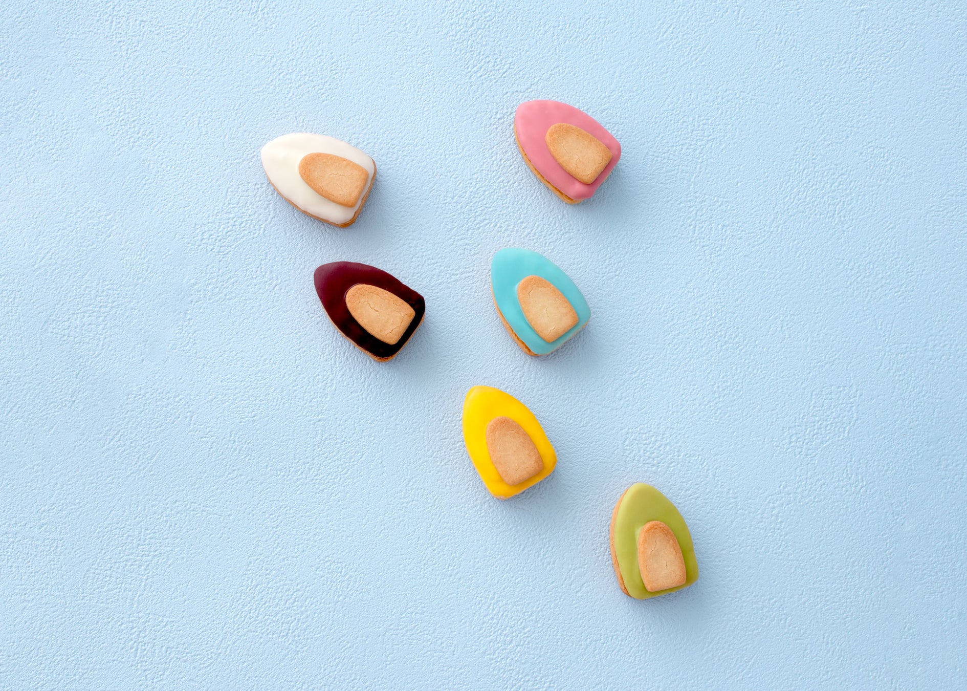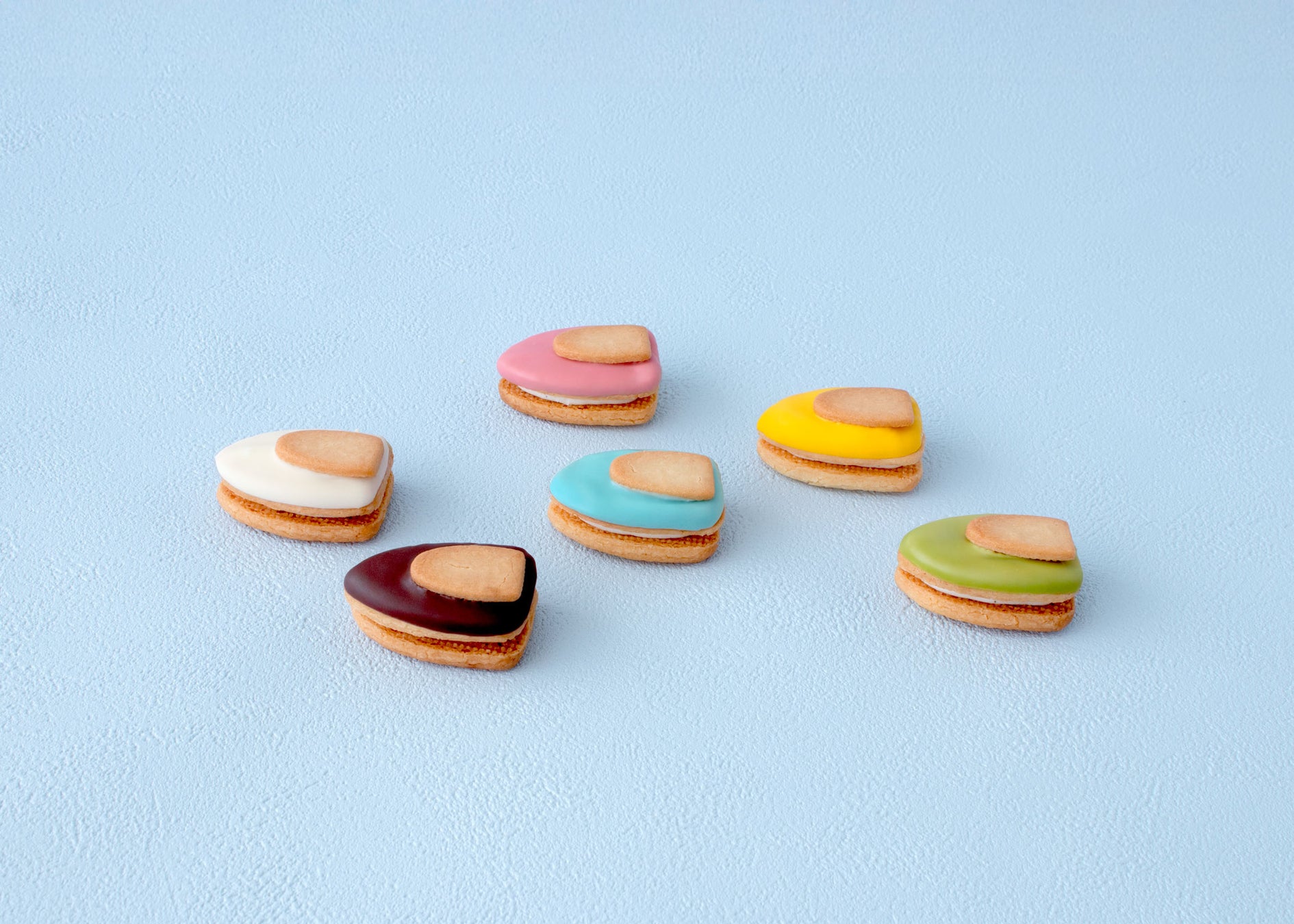 厚めのサブレでバニラクリームをサンドし、ボートレースの6艇のカラフルな色分けをチョコレートで表現したお菓子は、レースの臨場感を味わえるよう、1号艇から6号艇までの6種類、それぞれ異なるフレーバーでお作りいたしました。