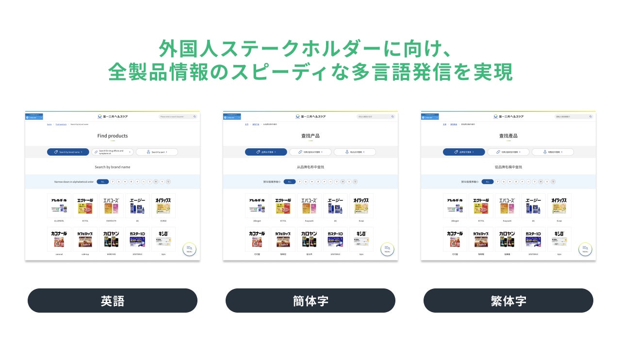 第一三共ヘルスケアウェブサイト内製品情報を、英語・繁体字・簡体字で公開しています。