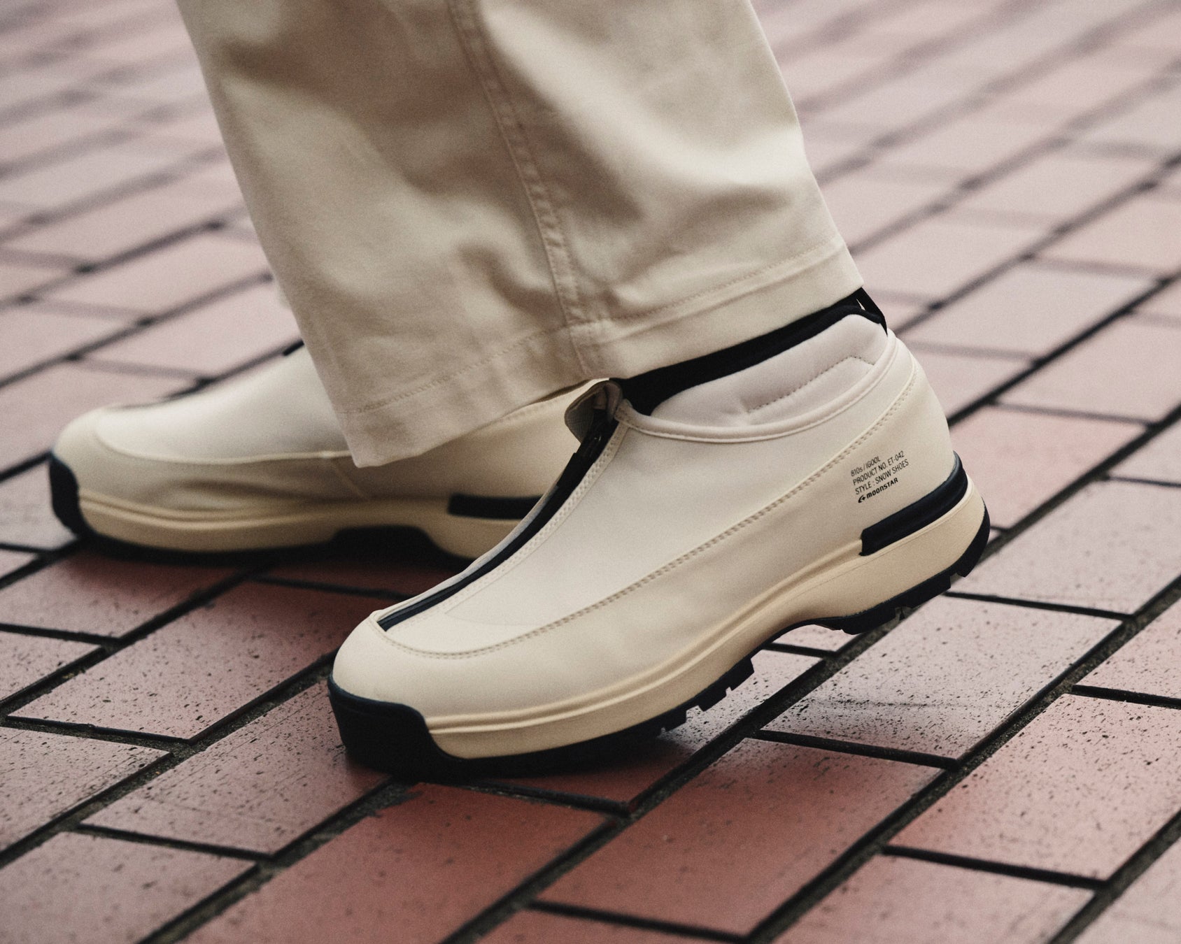 雪寒地用シューズの製造ノウハウをデイリーユースに。アウトソールには、氷上でも滑らないシロクマの足裏からヒントを得たガラス繊維配合ラバーを搭載し優れたグリップ力を発揮。ア ッパーは、着脱しやすいジッパーを搭載しながら、撥水加工を施したマテリアルで甲周りを覆った防水設計。氷上活動で必要な要素をシックな佇まいに整えたブーティタイプ。