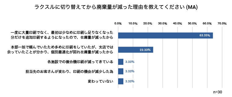 「オフライン販促の見直しがあり、印刷量が減ったから、印刷するアイテムが減ったから(30.43%)」、「本部一括で頼んでいたため多めに印刷をしていたが、支店では余っていたことが分かり、個別最適化が図れたから(21.74%)」という結果に。