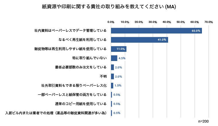 紙資源や印刷物に関する取組としては「社内資料はペーパーレスでデータ管理している(65.00%)」と一番多く、次いで「なるべく再生紙を利用している(41.00%)」となりました。