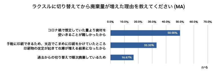 廃棄量が増えた理由第1位は「コロナ禍で想定していた量より資材を使いきることが難しかったから(50.00%)」。次いで「こまめに印刷をかけていたところ、印刷物の改定が起きて在庫が増える結果になったから(33.33%)」という結果に。