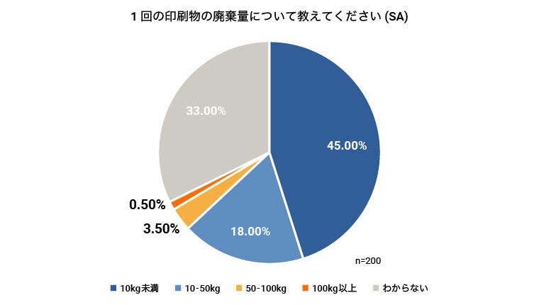 1回における印刷物の廃棄量は「10kg未満(45.00%)」と一番多い結果になりました。