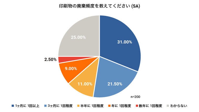 印刷物の廃棄頻度は「1ヶ月に1回以上(31.00%)」、「3か月に1回程度(21.50%)」とこまめに廃棄や在庫の棚卸をしている現状が分かりました。