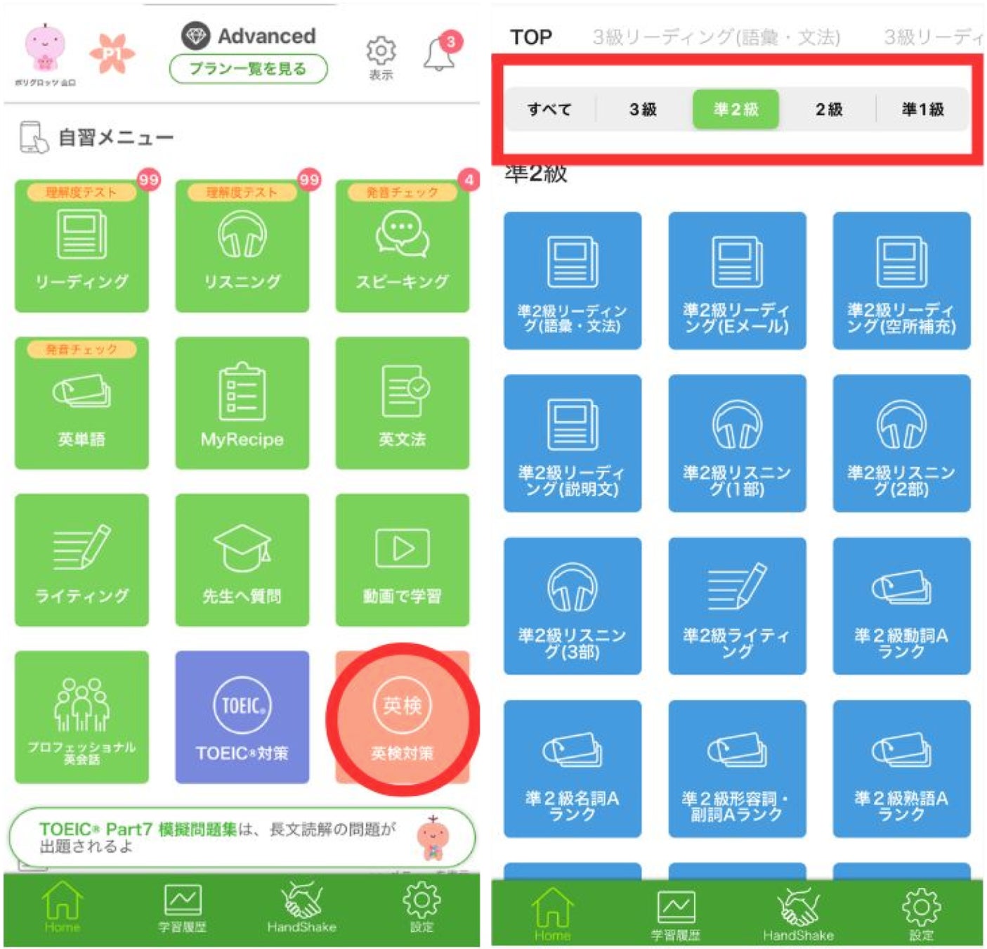 『レシピー』内のホーム画面から「英検対策」をタップして、上部のメニューから自分の挑戦したい級を選択します。技能・問題の種類ごとに項目が分かれているので、好きなところから学習をスタートできます!