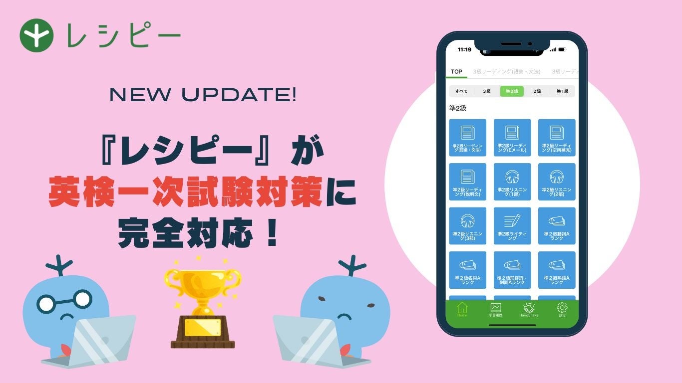 株式会社ポリグロッツ(本社:東京都新宿区、代表取締役:山口隼也)は、英検対策問題も豊富に揃った英語学習アプリ『レシピー』に、問題を大幅に追加するアップデートを行いました。この追加により、英検3級、準2級の一次試験における出題形式を網羅した対策が可能になりました。