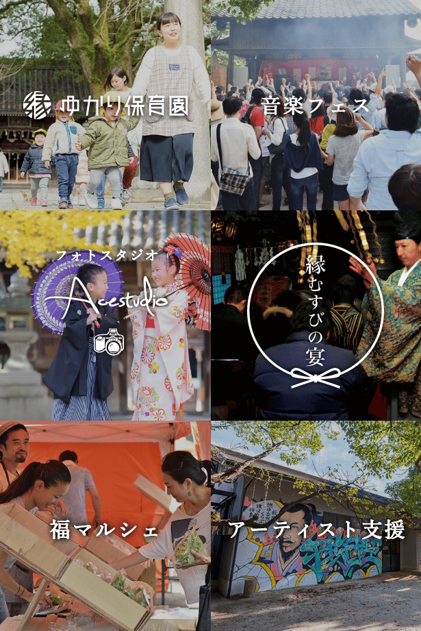 神社の長い歴史を引き継ぎながら地域のために何が出来るかを日々模索。神事のみならず、保育園の運営や音楽イベント、フェスなど、子どもからお年寄りまであらゆる世代が人が集う場所にするために、神社ならではの取り組みや新たな取り組みを進めています。