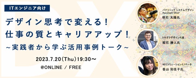 今回、 ITエンジニアが活用できる「デザイン思考」についてのセミナーを開催し、ユーザー中心の視点から、IT技術が本当に解決すべき問題を見つけ、最適な解を導き出すための手法を講演いたします。さらに、デザイン思考で自身のビジネスポジションをステップアップされた実践者の方々に生の体験談を語っていただきます。