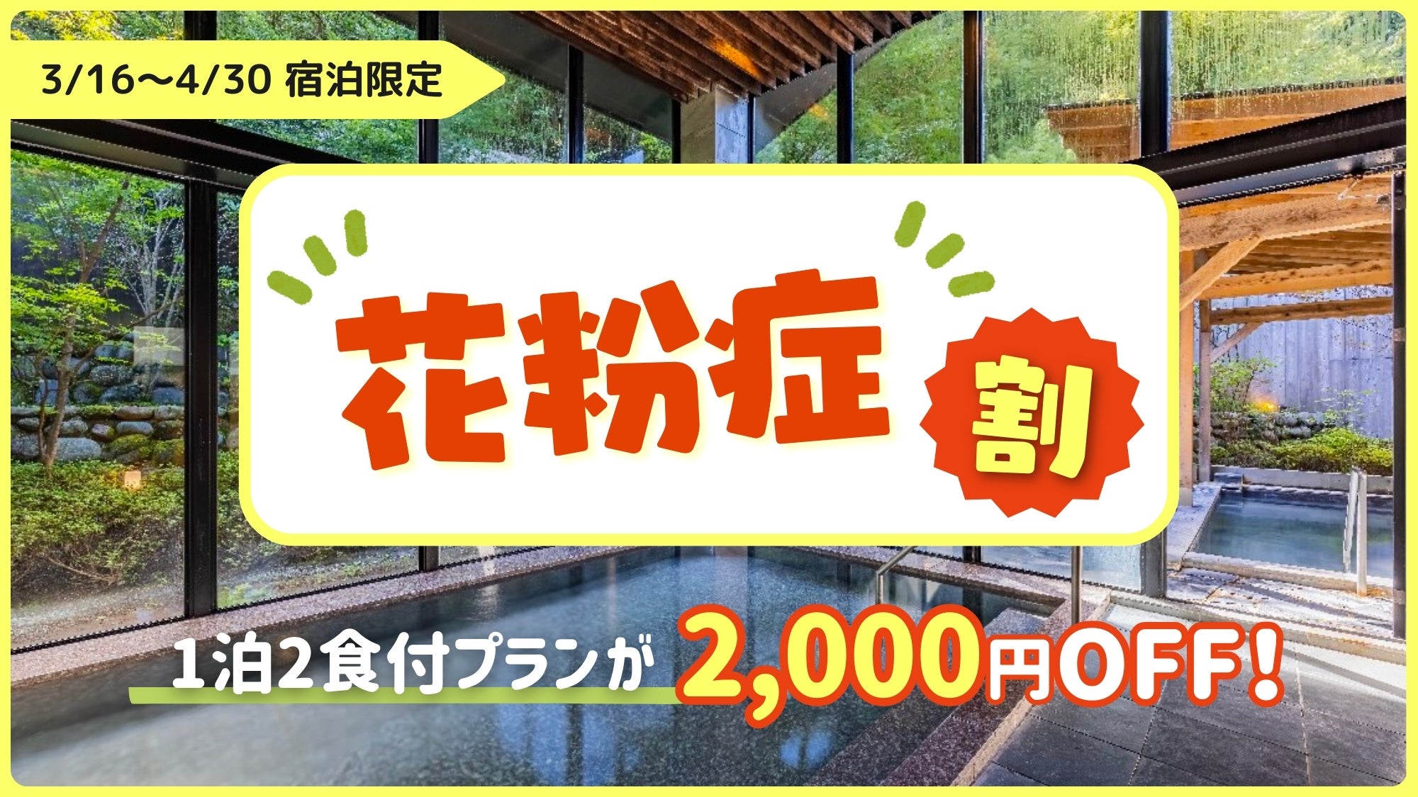 花粉症のつらい季節に、わざわざ自然豊かな箱根まで足を運んでくださるお客様へ。「花粉は完全には防げませんが、せめてお財布だけでも守りたい、癒やしたい」という思いから生まれました。通常のスタンダードプランよりあらかじめ2,000円もお得な特別価格となっております。浮いた2,000円は、旅行での美味しいお食事や、ご自身に一番合った対策グッズ代としてご活用ください。