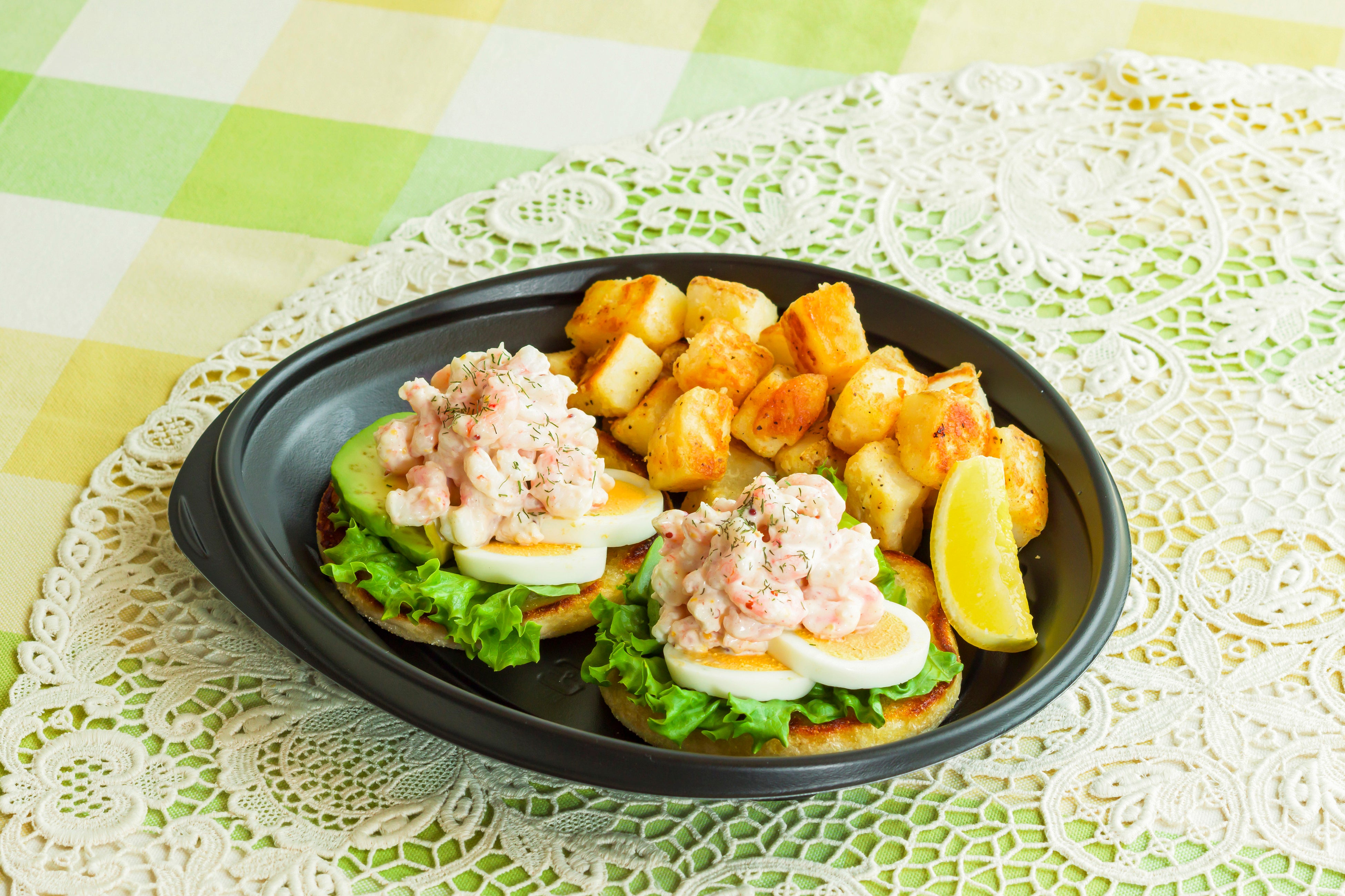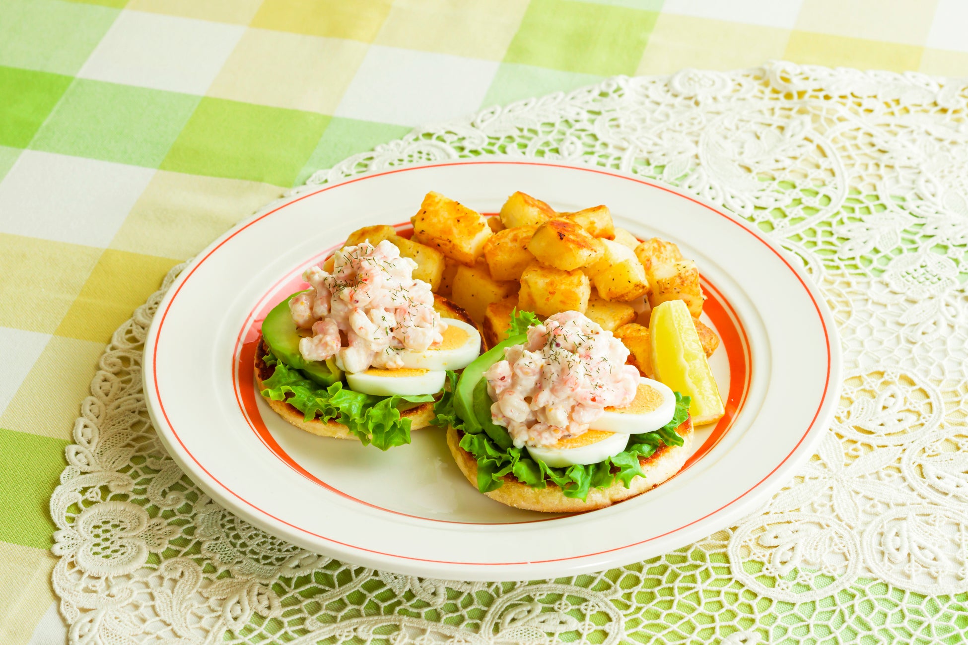 ボイルした甘エビを特製マヨネーズソースで絡めて、イングリッシュマフィンにのせたヨーロッパ発祥のオープンサンド。