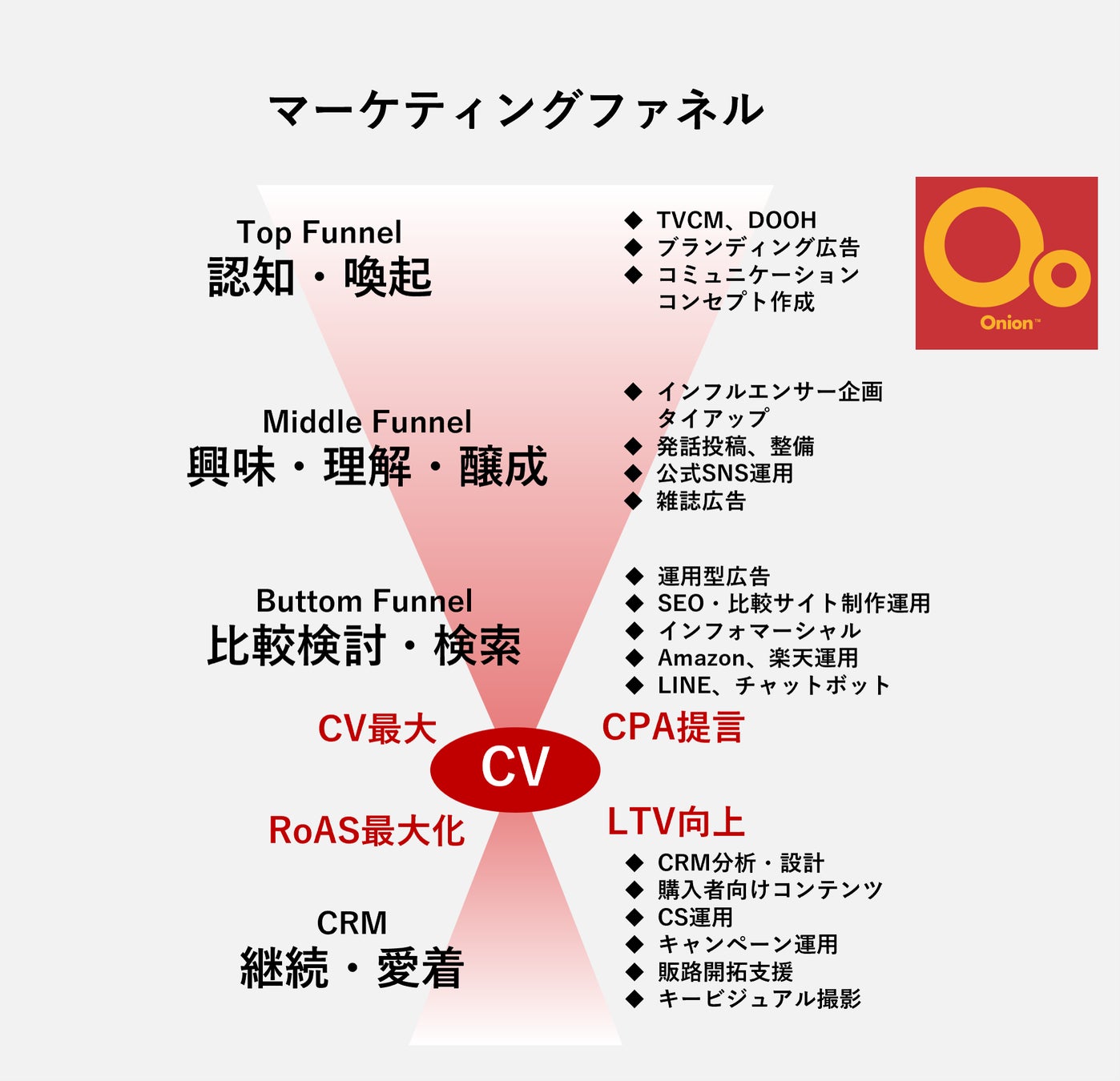 オニオンの持つ動画制作力とクリエイティブ制作力を活かし、Upper Funnel(認知・喚起)からMid/Lower Funnel(興味醸成・比較検討)、そしてCRM(継続・愛着)まで、一気通貫でのマーケティング支援が可能になります。従来、当社が強みとしてきたデータドリブンマーケティングと成果報酬モデルに、オニオンのブランド文脈設計と感性価値の創出力が加わることで、クライアントのKPI可視化とブランディング投資の両立を実現します。