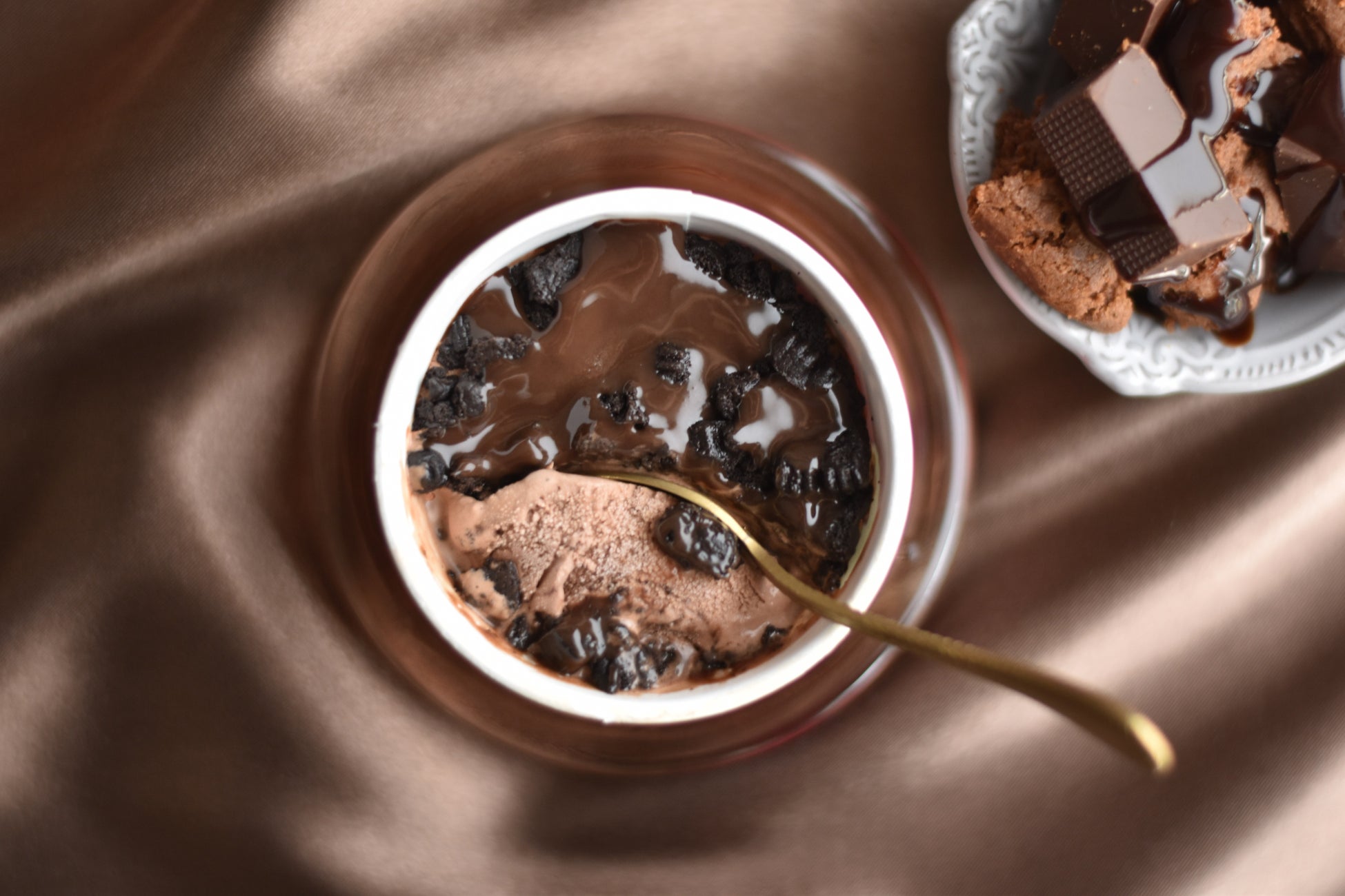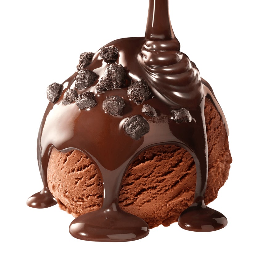 チョコレートアイスクリームにビターチョコレートソースを混ぜ込み、ミルクココアソースにまみれたチョコレートクッキーをのせました。
