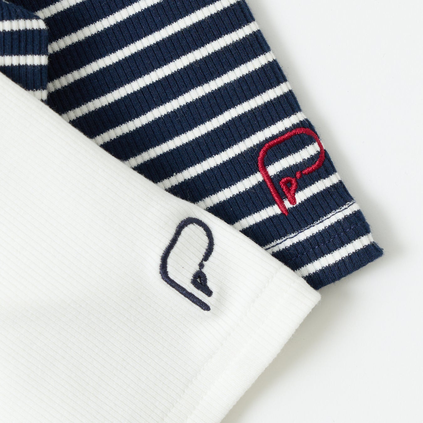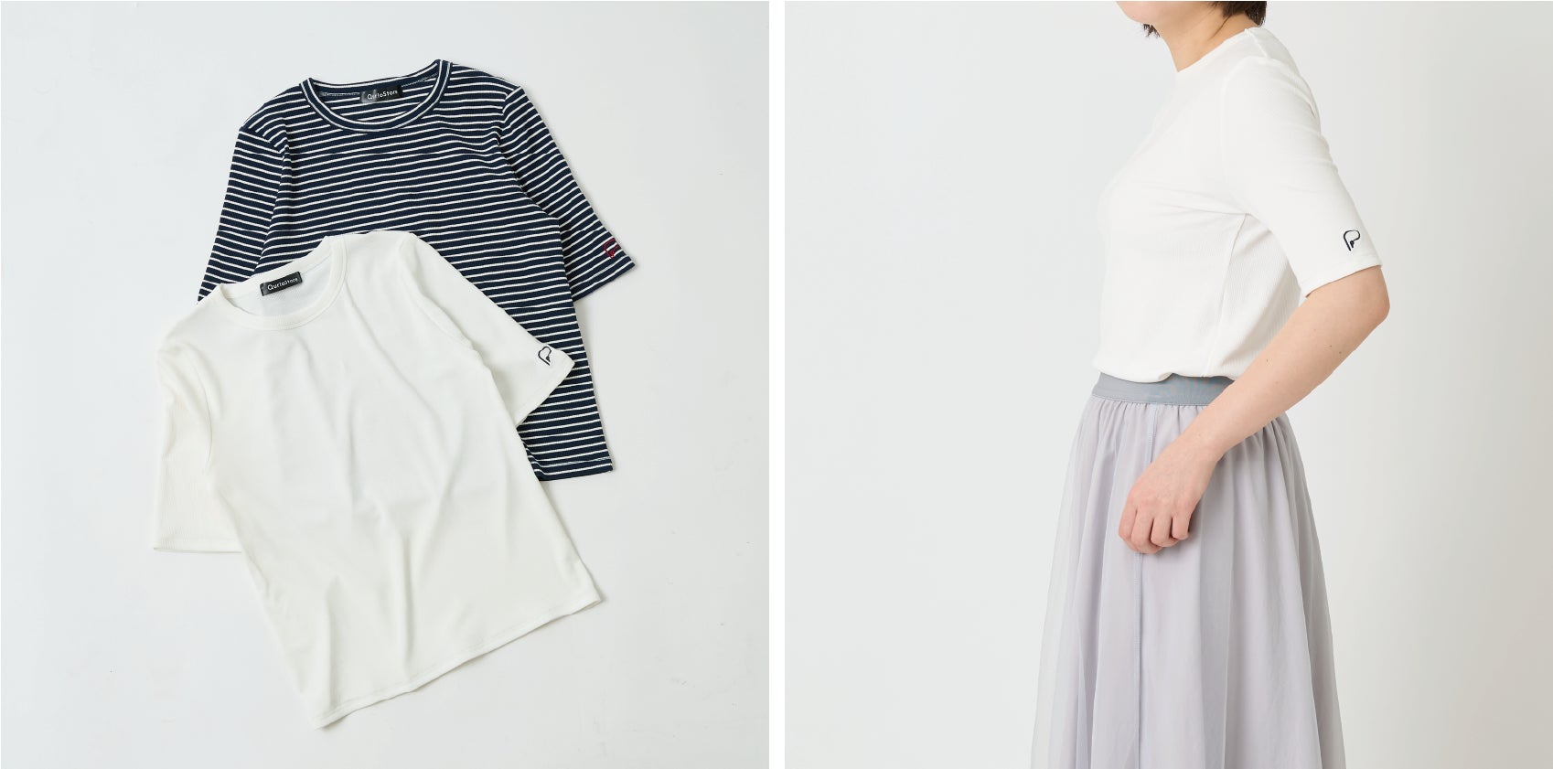 カラーはネイビー/ホワイトのボーダー、アイボリー単色の2パターンを展開。肌触りの良い生地で、きれいめカジュアルにぴったりです。
