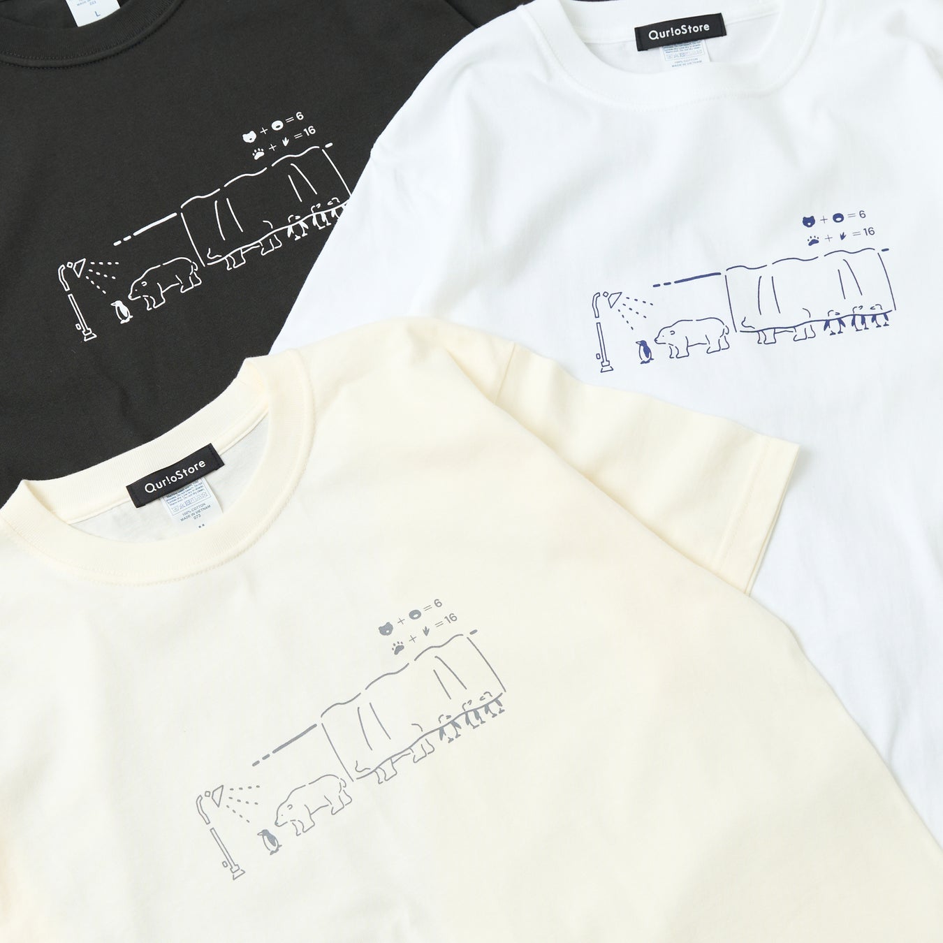 小学校でおなじみの算数の問題「つるかめ算」を、シャワー中のシロクマとペンギンに置き換えたかわいいデザインのTシャツです。シャワーに並ぶ動物たちの側には、2種類の動物の足の数と頭の数から、それぞれの数を求める「つるかめ算」の数式がプリントされています。