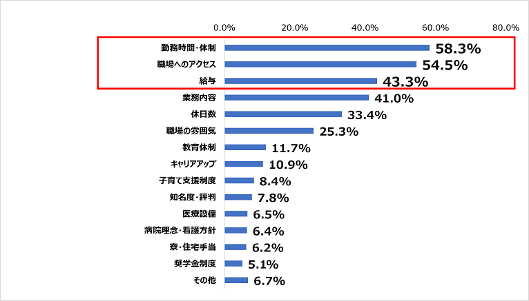 「勤務時間・体制」が58.3%、「職場へのアクセス」が54.5%、「給与」が43.3%となっており、職場選びの際には具体的な条件面などを重視していることがわかる。